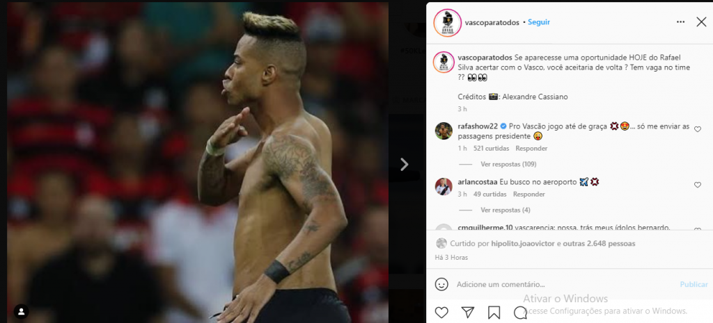 O atacante Rafael Silva, de 30 anos, que teve uma passagem pelo Vasco da Gama entre os anos 2014 e 2015, comentou em seu perfil no Instagram que jogaria no Cruzmaltino de graça.