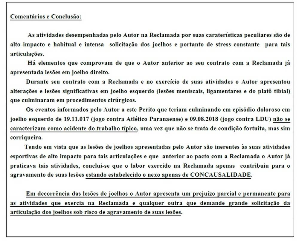 No dia 20 de outubro de 2021, o médico perito judicial José Roberto Portante emitiu relatório após avaliar o zagueiro. Segundo a avaliação, o caso não se configura como “acidente do trabalho típico, uma vez que não se trata de condição fortuita, mas sim corriqueira.” Mas também apontou que a atividade desempenhada no clube “contribuiu para o agravamento de suas lesões estando estabelecido o nexo apenas de concausalidade”. Veja abaixo o relatório do médico: