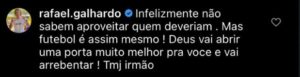 O meia Bruno Cosendey usou suas redes sociais para se despedir do Vasco da Gama na última sexta-feira (14). O jogador estava no clube desde a categoria de base, e Rafael Galhardo, também ex-jogador do Cruzmaltino não poupou as palavras ao comentar a saída do amigo. O lateral, que jogou com Bruno Consendey, criticou a forma como o Gigante da Colina aproveita as joias da base.