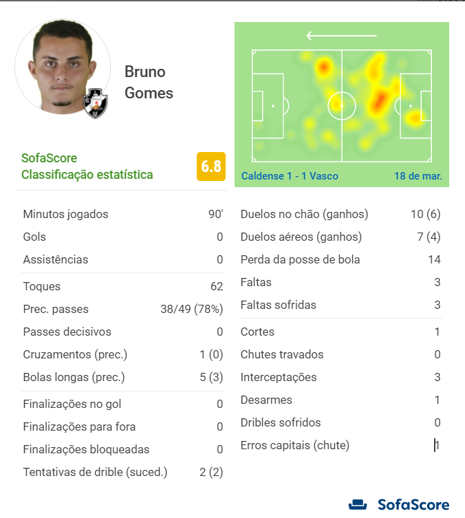 Para exemplificar o momento de Bruno Gomes, o Papo na Colina foi atrás dos números do volante nas partidas da Copa do Brasil, que são os jogos que são disponibilizados pela plataforma SofaScore: