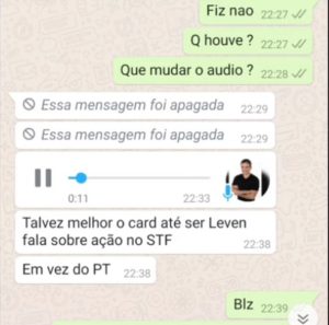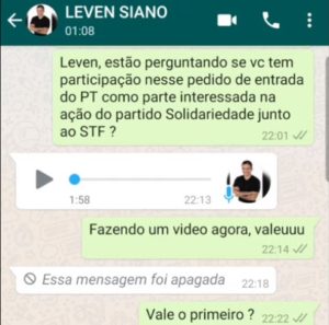 A orientação dada pelo ex-candidato é de intitular o vídeo com a informação de que ele fala sobre a ação do STF e não citar o PT. O canal então segue as orientações e publica o vídeo em que parte do título é “Leven manda áudio sobre STF”.