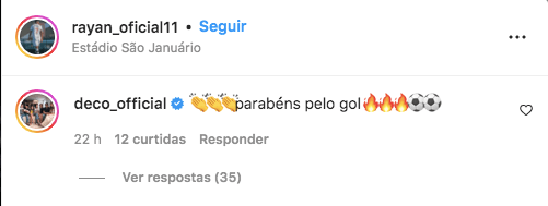 Na manhã desta quinta-feira (19), o Diario Sport noticiou o interesse do ex-craque Deco em levar Rayan, jóia da base cruzmaltina, ao Barcelona B para maturar e posteriormente reforçar a equipe blaugrana. Após a notícia correr as redes sociais, comentários feitos pelo antigo meia luso-brasileiro chamaram atenção em publicações do jovem jogador vascaíno. Vale lembrar que Deco é atualmente o encarregado do Barcelona em achar novos talentos pelo Brasil e Portugal para o clube espanhol.