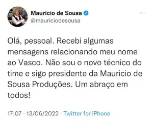 “Olá, pessoal! Recebi algumas mensagens relacionando meu nome do Vasco da Gama. Não sou o novo técnico do time e sigo como presidente da MSP (Mauricio de Sousa Produções). Um abraço a todos!”, disse o pai da Turma da Mônica.
