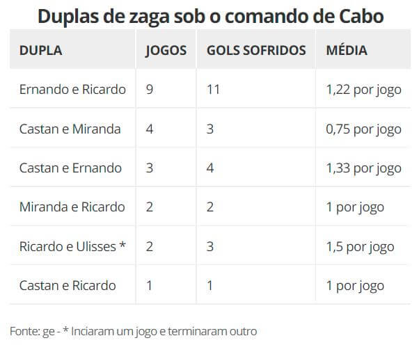 Segue abaixo, uma tabela com dados das duplas de zaga Vascaínas até o presente momento: