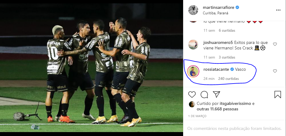 O atacante Rossi, na conta oficial do próprio Sarrafiore, postou “Vasco”, o que demonstra que o Gigante da Colina pode ser realmente o destino do argentino. Na postagem, Sarrafiore agradeceu o clube da capital paranaense em claro tom de despedida. A postagem também demonstra, claro, o carinho que Rossi tem pelo seu ex-clube, onde ficou conhecido pela garra, pela entrega em todos os jogos.