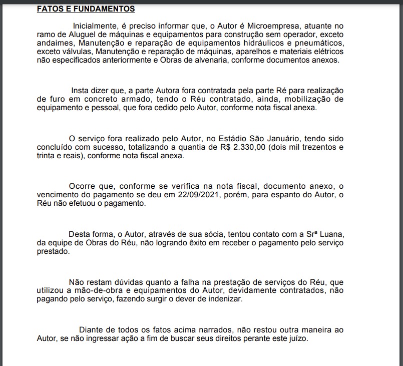 Nesta segunda-feira, a empresa FUROSCORTES COMERCIO MANUTENCAO E LOCACAO DE FERRAMENTAS LTDA, entrou no justiça contra o Vasco visando cobrar R$ 2.330,00 (+ R$ 20.000,00 de danos morais) pelo serviço realizado em 29/09/2021, em São Januário.
