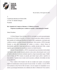 Nesta quarta-feira (24), o presidente do Vasco, Jorge Salgado, entregou um documento com recomendações de ações para combater o racismo no futebol ao presidente da CBF. A declaração foi feita durante o Seminário de Combate ao Racismo.