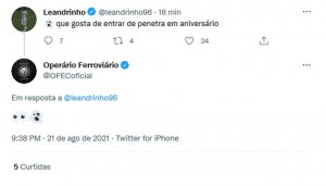 Mesmo sem jogar, Leandrinho, que está se recuperando de lesão e só volta em 2022, cutucou Vasco em sua rede social após derrota para o Operário por 2 a 0 “Fantasma que gosta de entrar de penetra em aniversário”. O comentário foi respondido pelo perfil oficial do clube. O jogador marcou o primeiro gol no primeiro turno na vitória também de 2 a 0 no Gigante em São Januário.