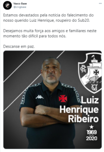 O Vasco da Gama, através de seu perfil da base no Twitter, lamentou a morte de Luiz Henrique, roupeiro da equipe Sub-20.