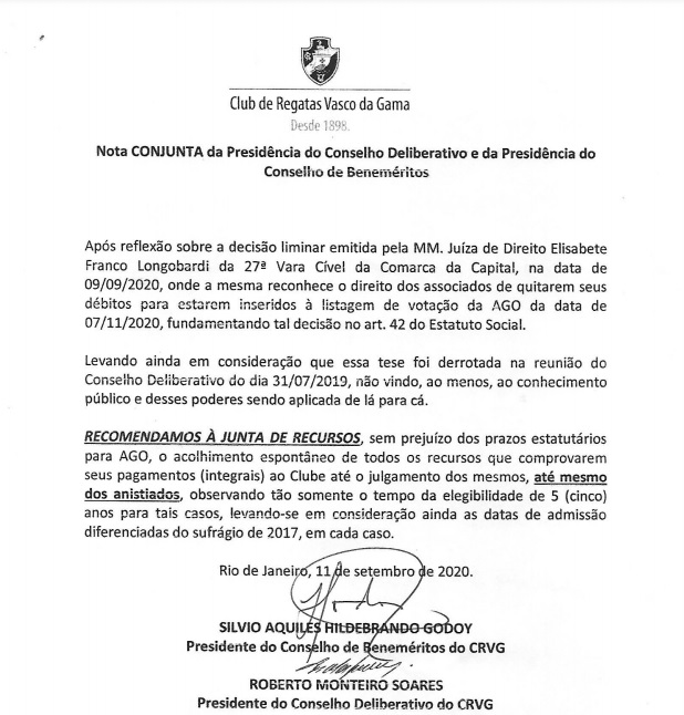 O Conselho de Beneméritos e o presidente do Conselho Deliberativo assinaram uma nota, nesta sexta-feira, na qual solicitam aos sócios, que não estão na lista, a apresentarem os comprovantes de pagamentos.