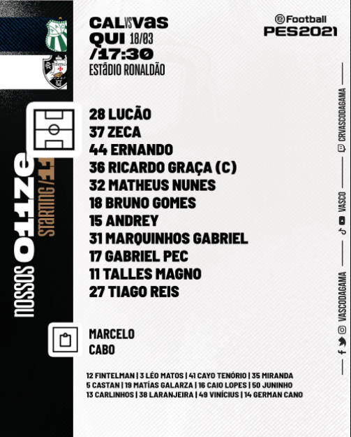 O Vasco divulgou oficialmente, através de sua conta oficial do Twitter, a escalação que vai enfrentar a Caldense, nesta quinta-feira, pela Copa do Brasil.