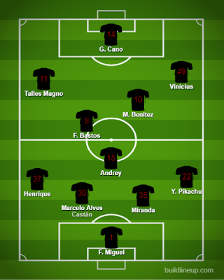 Provável time com a entrada do atacante: Fernando Miguel, Pikachu, Miranda, Marcelo Alves (Leandro Castán) e Henrique, Andrey, Fellipe Bastos e Benítez, Vinícius, Germán Cano e Talles Magno.