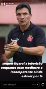 Após empatar por 1 a 1 dessa sexta-feira (22), com a Chapeconse na Arena Condá, pela terceira rodada da Série B, o ator Bruno Mazzeo demonstrou sua indignação com o técnico Zé Ricardo no Instagram: “Sequer ligarei a televisão enquanto esse medíocre e incompetente ainda estiver por lá”. É a segunda vez que o artista faz uma crítica em sua rede social ao treinador, na primeira rodada fez uma postagem com a foto do técnico escrito “Medíocre”.