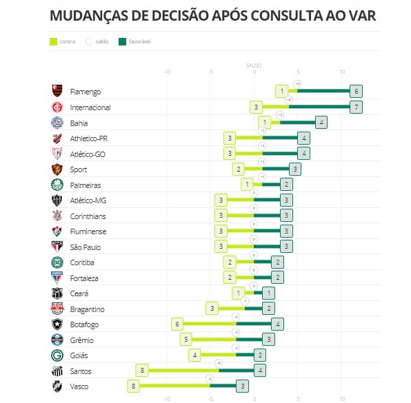 O VAR segue sendo um dos assuntos mais comentados do futebol brasileiro, até por ainda ser uma novidade. Muitos testes ainda estão sendo feitos. Como é uma pauta que os torcedores gostam de debater bastante, o ge resolveu fazer um ranking de interferências do equipamento, nesta segunda-feira, e contemplou os 20 clubes da primeira divisão nesta tabela; o Gigante da Colina aparece como o que teve mais decisões contrárias.