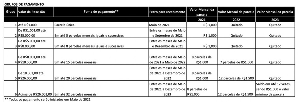 Antes as parcelas eram de acordo com os percentuais do salários, agora a proposta é para que sejam fixas. Confira os valores na imagem abaixo.