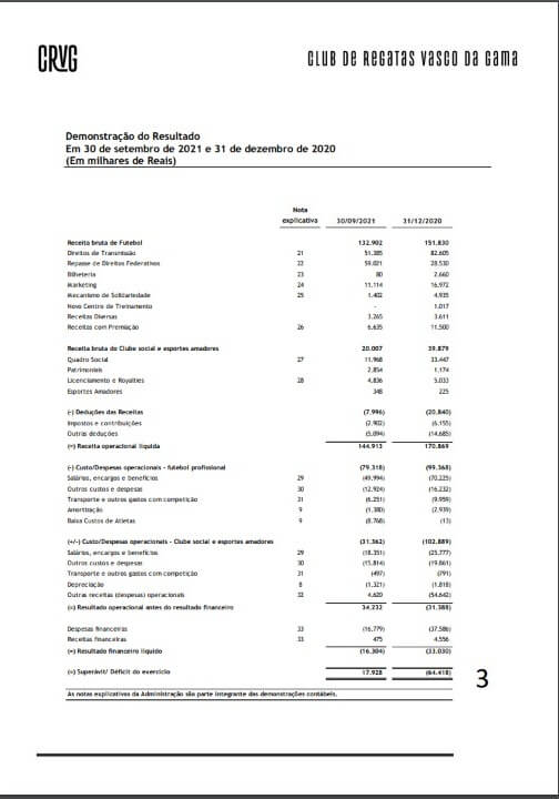 Todo o balancete do Clube está disponível no site oficial do Vasco, e a análise do jornalista foi feita dos meses de Janeiro de 2021 até setembro.