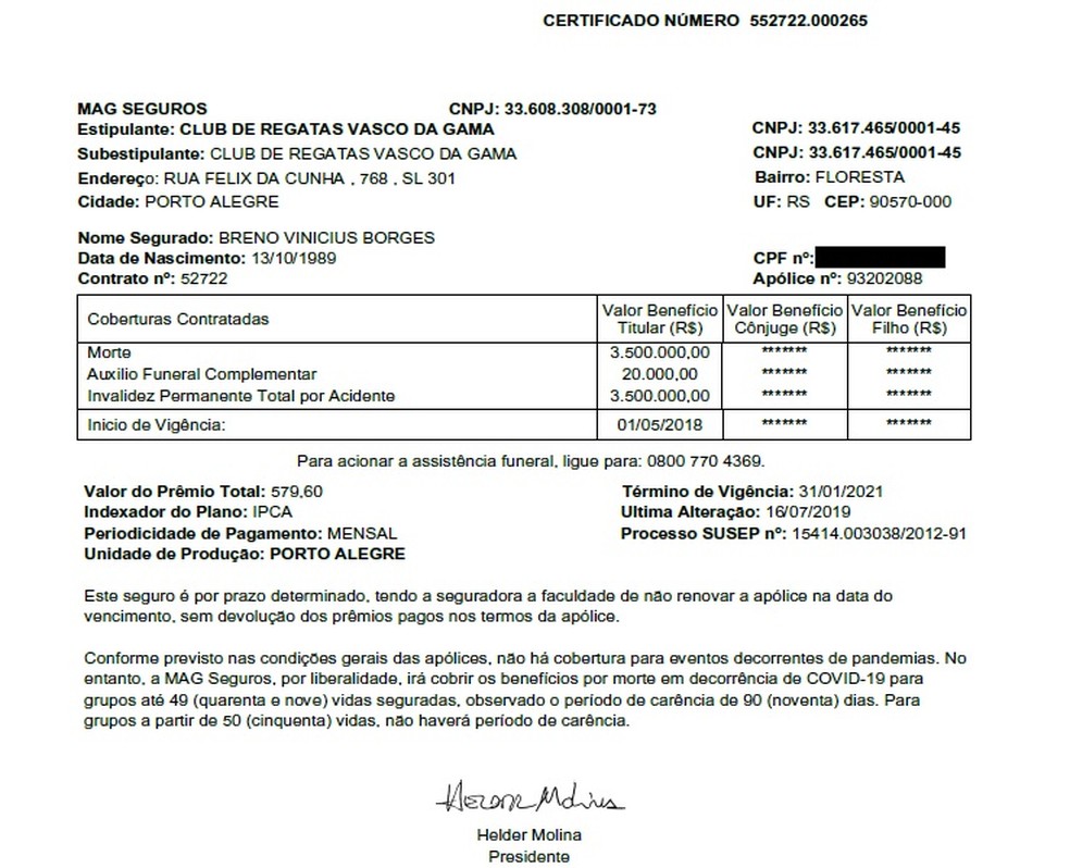 O clube também apresentou uma cópia da apólice de seguro do jogador, em resposta ao pedido de indenização pela não contratação.