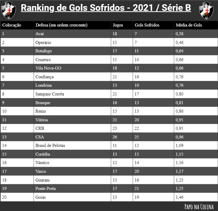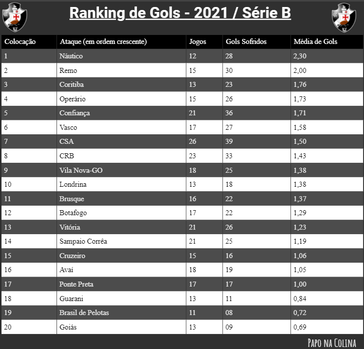 O Vasco que conta com o artilheiro Germán Cano também não deixa a desejar em termos ofensivos. Se a temporada de 2020 foi de poucos gols, o mesmo não pode ser dito em relação a 2021. O Vasco é o 6º clube da Série B que mais marcou gols no ano. Foram 27 gols em 17 jogos, isto é, o gigante da colina marca 1,58 gols por jogo.