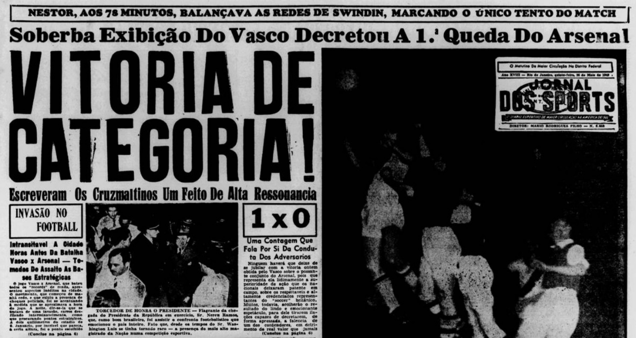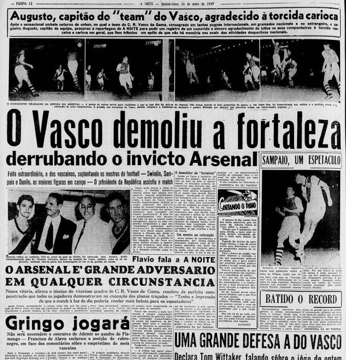 O Vasco há 72 anos vencia o Arsenal por 1 a 0, com gol de Nestor. O jogo guarda dados memoráveis, conforme lembra o jornalista Alexsander Silva. De acordo com os jornais da época, 60 mil pessoas estiveram em São Januário no dia 25/05/1949 para assistir o confronto contra o Arsenal, que na época era o clube com mais títulos no Campeonato Inglês (6).